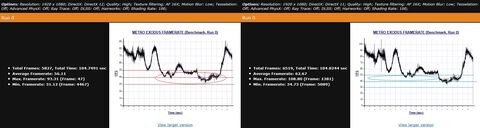 Mutatok két mérést nincs sok közöttük de a grafikonon látszik hogy az egyiknél gyakrabban süllyedt kritikus szintekre mint a másiknál de átlagon és a minimum fps-en csak párnak tűnik a különbség.