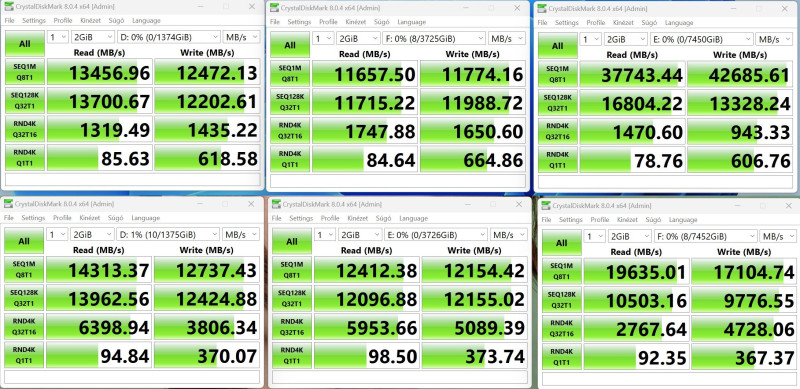 Többi játékban is hasonlóan teljesít, ugyan azt tudja mint a 14900K. Munkában pedig sokkal többet, így melóra + játékra (természetesen OC-val) egy verhetetlen konfig. Nem kell kompromisszumot kötni a ram miatt, hiszen itt 4x annyi van mint inteles konfignál. Kicsit sajnálom, hogy nem próbáltam ki a 32 magost, de ami késik, nem múlik.Raid: sajnos raid-ben ugyan úgy problémás a random 4k írás-olvasás. Felső sor bekapcsolt amd raid vezérlő, az utolsó 4db crucial 2tb nvme ssd. Alsó sorban sima nvme meghajtók, az utolsó windows 11-el összefűzött "raid0" kötet. Az első ssd egy crucial T705. [link]