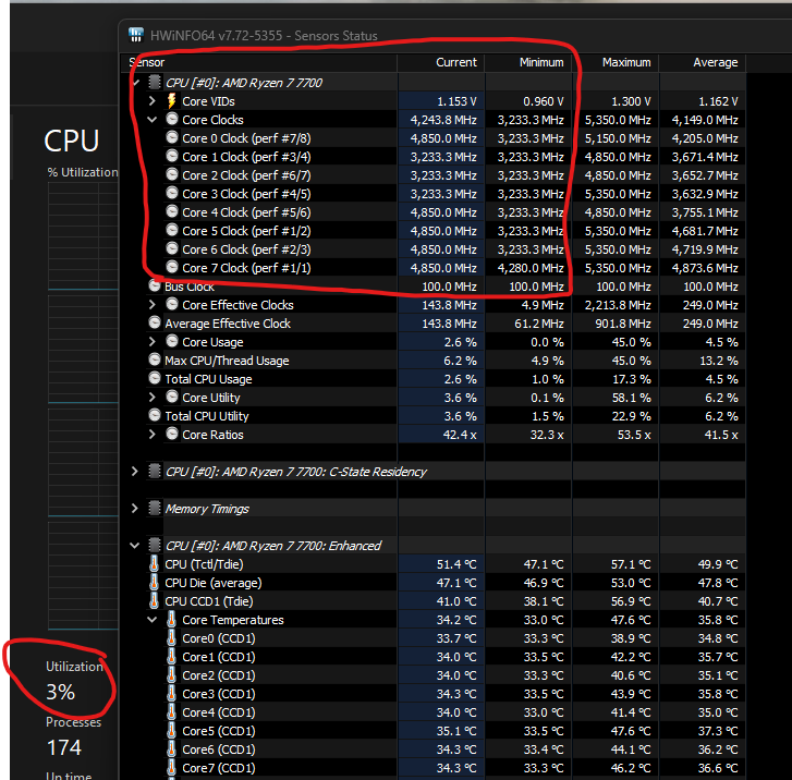 a proci windows asztalon, nyugalmi helyzetben is elég magas órajelen megy, minimális terhelés mellett: