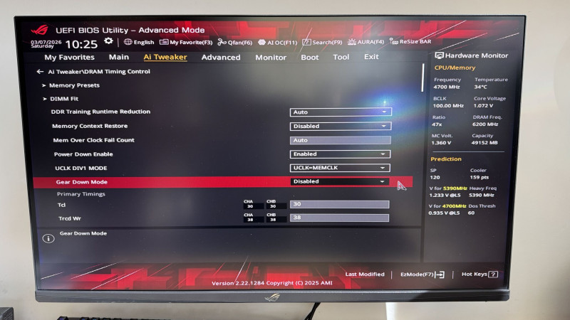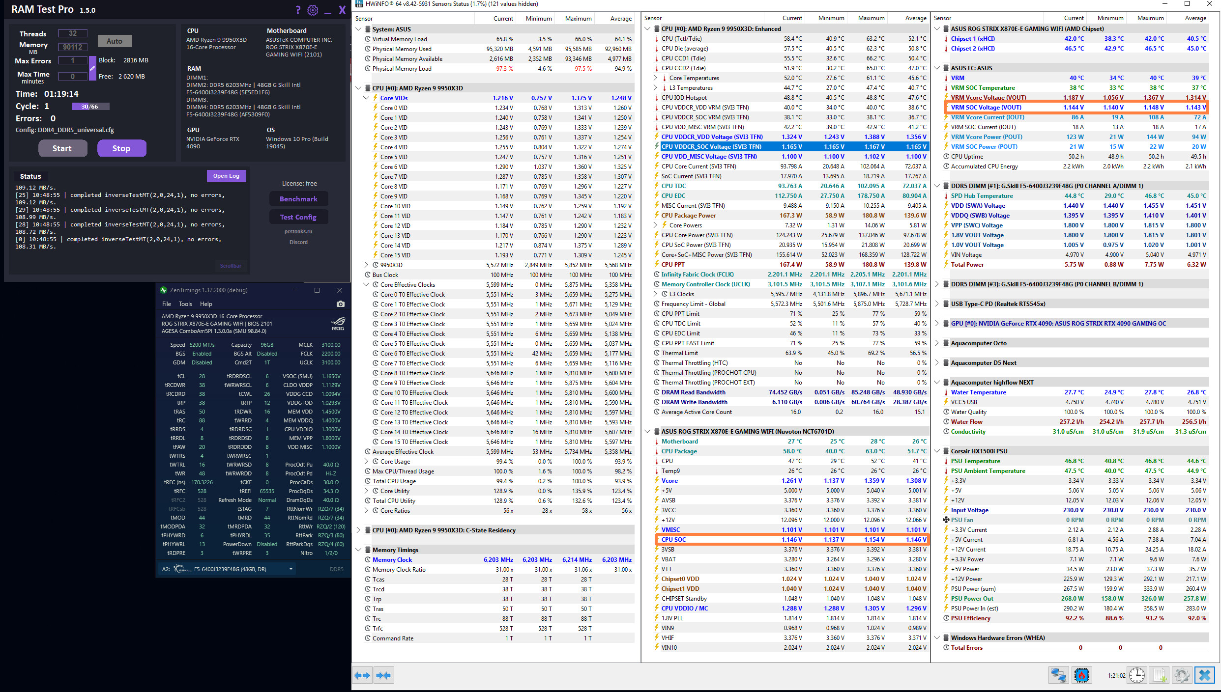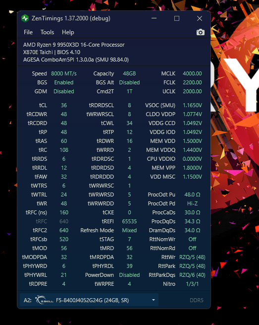 Ez stabil 6000mhz cl30 on alap procodt és stb stb 1.29vdd 1,29 vddq 1.00 vsoc , timingok nagyon szűkek és kitaláltam hogy 6200 ra felhúzom ami nagyon sokáig olyan instabil volt h minden meghalt alatta