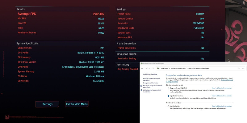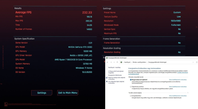 Cyberpunk benchmark brutálisan gpu limites.Szóval ne itt akarjátok összehasonlítani az energiasémákat. 3080 helyett 5090 kéne oda ,hogy láss valamit.