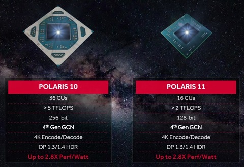 The Polaris 11 number is taken from the respective scores from 3DMARK 11 and 3DMARK Firestrike, comparing a mobile system with an Intel i7-4600M CPU with either an R9 M280X or an RX 480M. The R9 M280X scored 5700 and 3500 with a total board power of 82W while the RX 480M system scored 7200 and 4070 with a board power of 35W.
