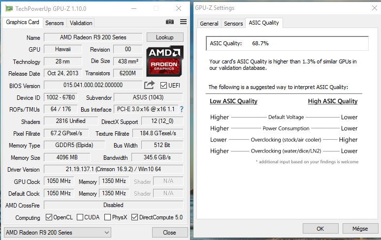 A GPU-Z szerint is ritka alacsony ASIC, azt mondja a lapkák 98,7%-a ennél magasabb, az azért nem kevés.