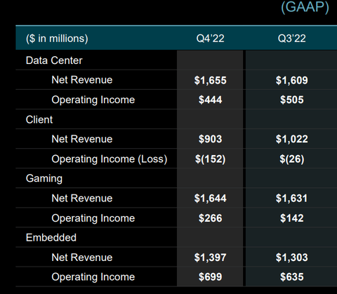 - "Client and gaming will decline - 2H22 was rebalance, made progress exit Q4. Will still ship below consumption in 1Q. Grow in 2H, but overall client will decline. Gaming similar. But console demand is strong."