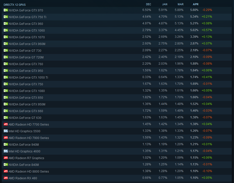 Meg a Top 25-be se fert bele az RX480 a maga 1.1%-aval, megnezheted a tavaly megjelent Pascal-okat hol vannak, meg a meregdraga GF1080-bol is masfelszer annyi van ott mint az RX480 "nepkartyabol".