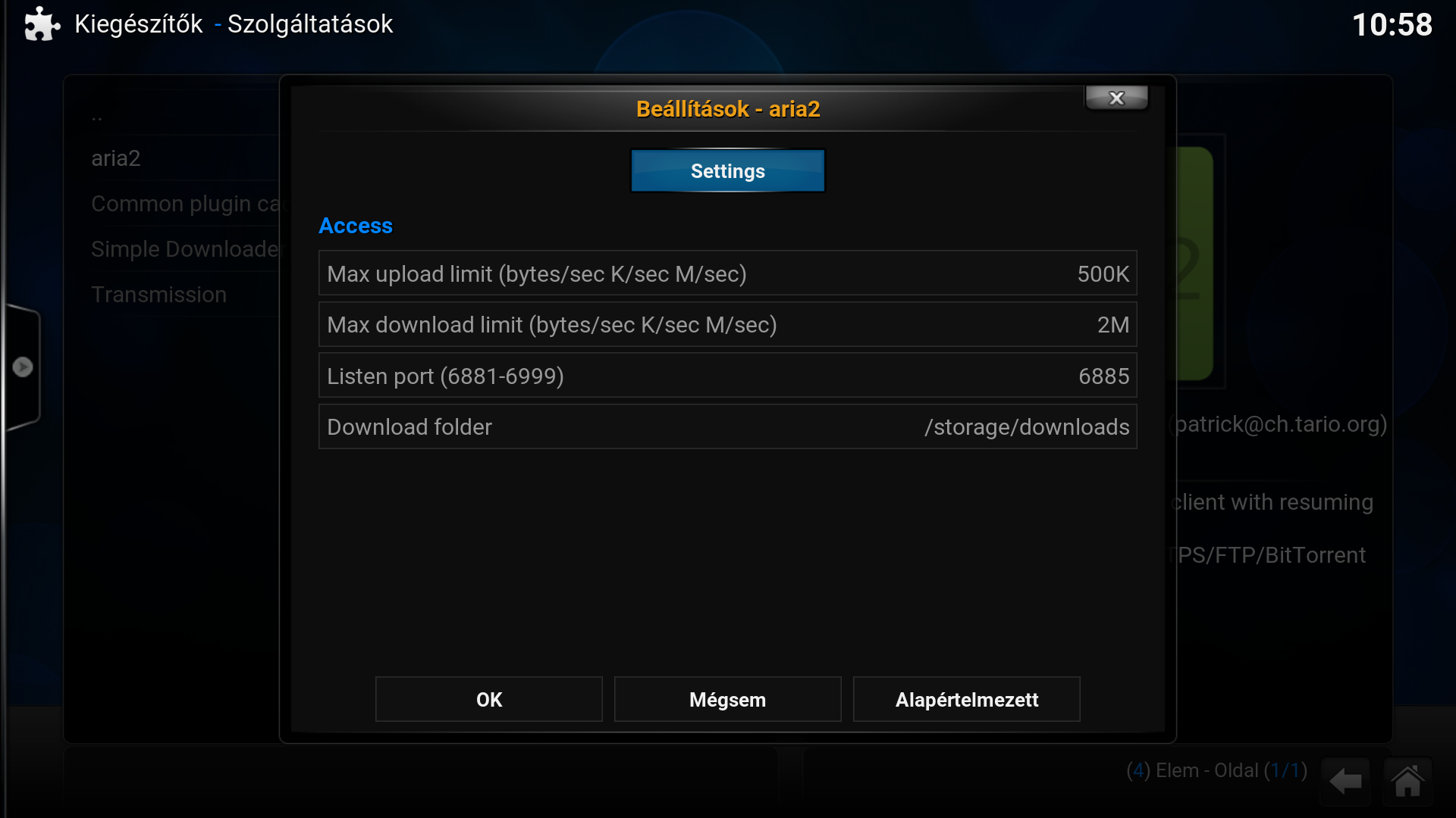 aria2.conf a /storage/.kodi/addons/service.aria2 könyvtárban található, itt lehet az igényekhez igazítani.