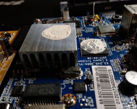 leszedve egy teljesen száraz gumi állagú valami volt a "hővezető" réteg én simán fehér sziloplasztra tippelek: