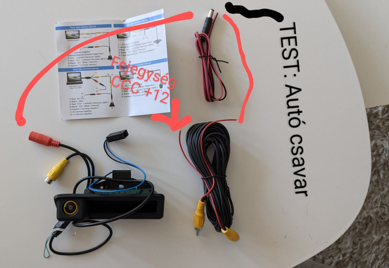 A vevő készüléken pedig csak egy sárga rca, illetve egy piros + fekete szál. A feketét tettem a testre, a sárga ment a kamera rcaval össze. Illetve a piros a reverse szálra.