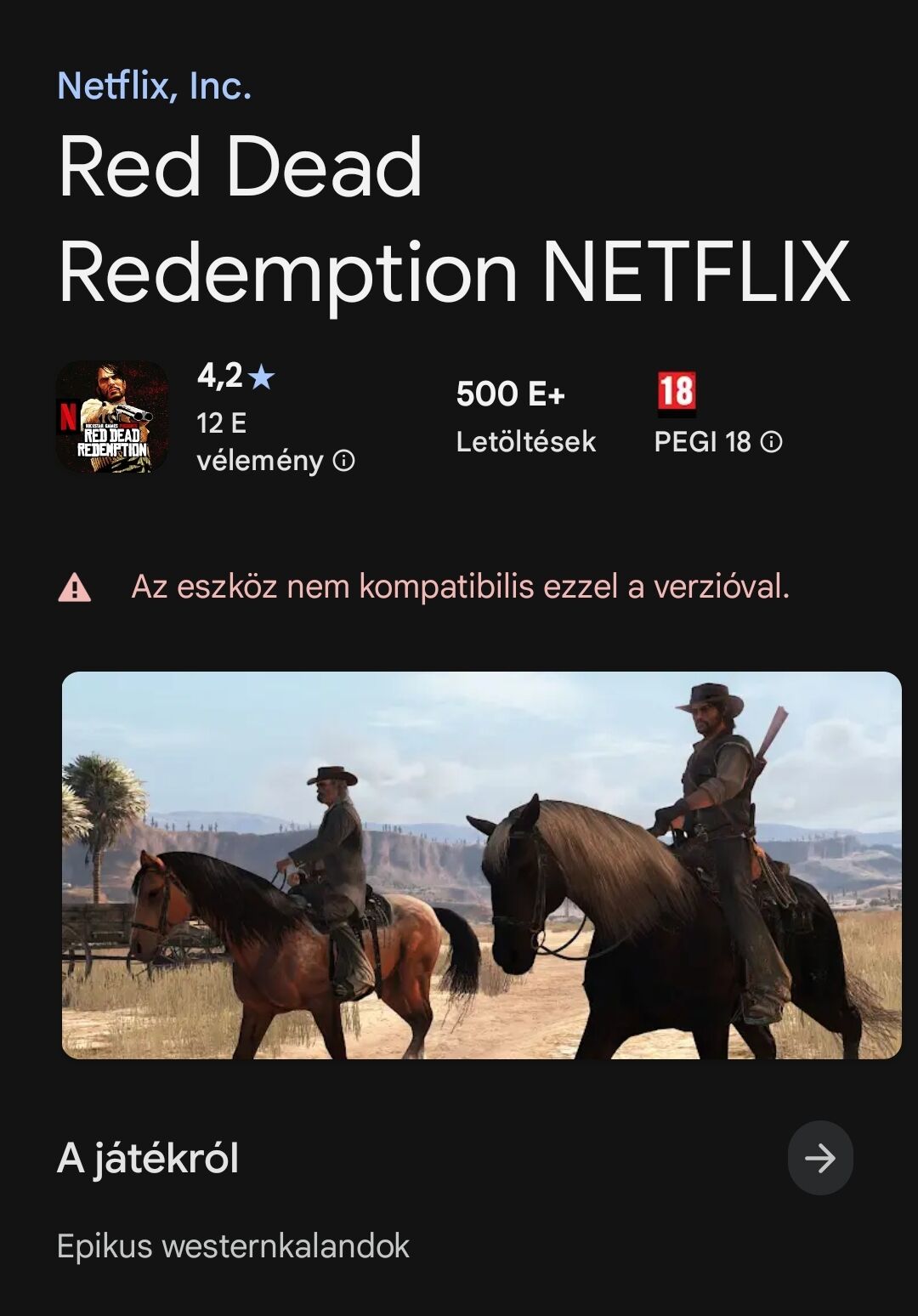 Megjelent a Red Dead Redemption androidra (is). Csak azért nem linkelek, mert van Netflixes és fizetős verziója is, ez utóbbi 16 rugó, ami még számomra is értelmezhetetlen.