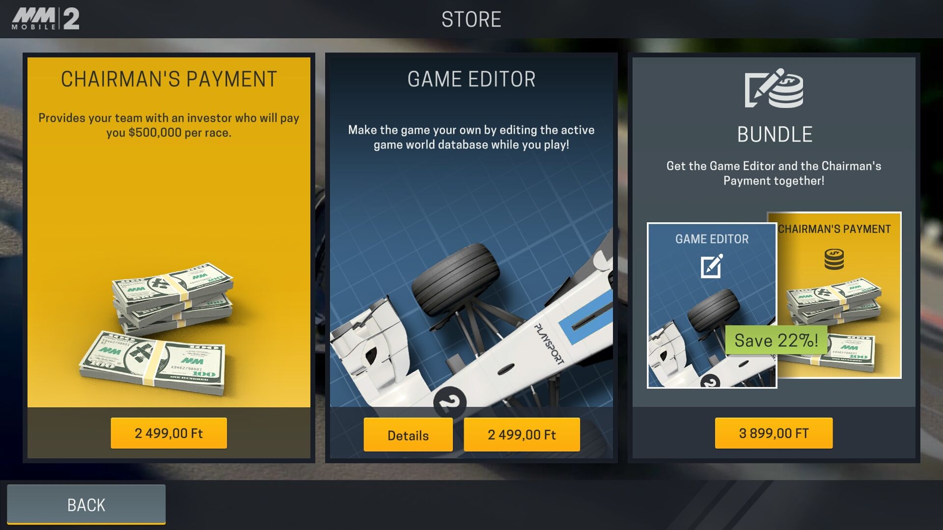 "The game costs $3.99, and there are two IAPS, a Game Editor for $6.99 (lets you edit the drivers, teams, and tinker with the rules) and a Chairman's Payment for $6.99, which gives you more money per race (making the game easier to play). The editor is quite fun to have if you like the game since you can turn MMM 2 into a more faithful Formula 1 management game." - [link]IOS-en mindig kiírják az IAP tételeket: