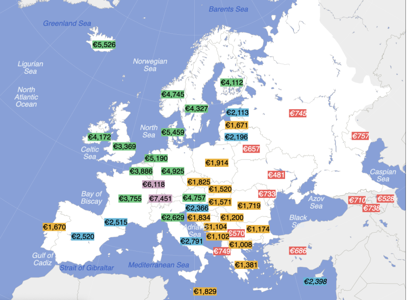 Kábé stimm, a spanyol és a portugál közötti kb duplázás nekem nem volt meg. Ez ugye az átlag, az egyes szakmákra nagyon másképp nézhet ki a térkép = nem feltétlen maradnak az arányok.