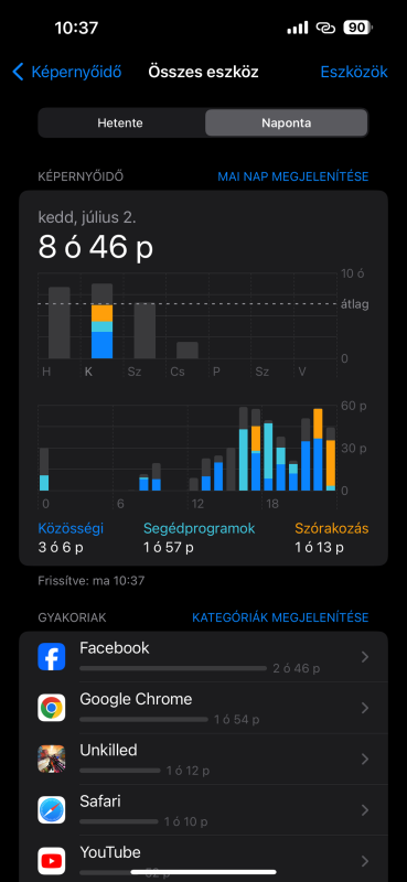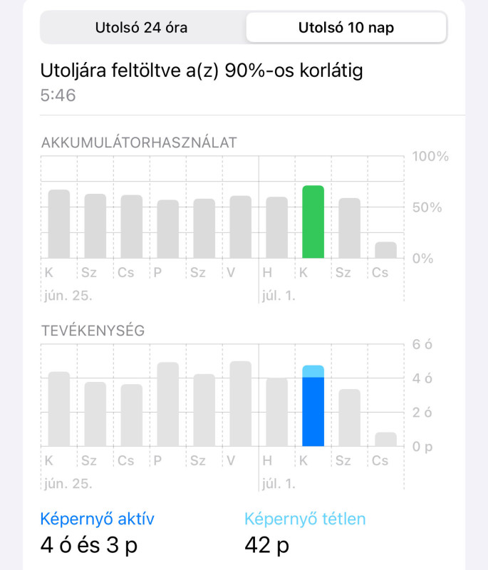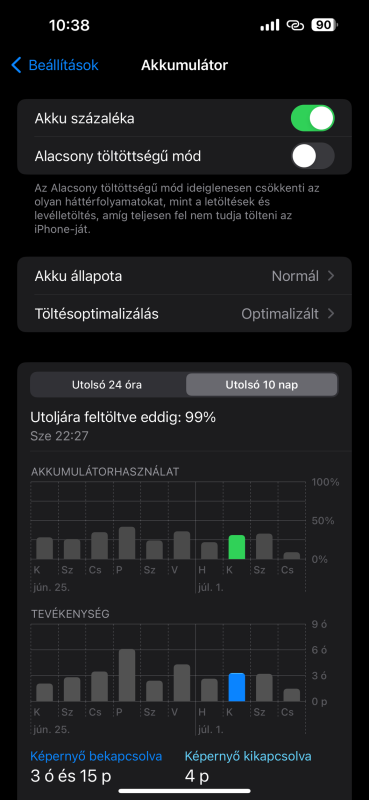 Üdv . ( kell nekem a kijelzőidőt nézegetni ) . 15 Pllus , vegyük a keddet , a beállítások beállitasokban a kijelzőidő 8 óra pár perc , aztán átmegyek az akkumulátor részre és láss csodát ott már csak 3 óra pár perc …. Az is tény , h nyilvánvalóan nem nyomogattam a telót 8 órán keresztül . Ez a jelenség kb 2 hete van , előtte nem volt ilyen . Nálatok mi a helyzet ? Ja és kb 2 naponta töltöm a telót .