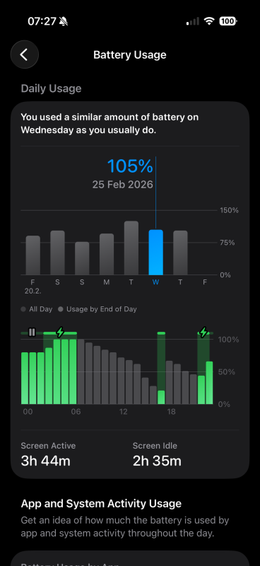 Nem másfél év alatt hanem 4 hónap alatt adta azt le. Mert az IOS 26-ig stabilan volt 100% mihelyst ki jött elsőnek 99%-ra aztán gyorsabban ért le 94-re. Lehet hogy nem kellene rá feszülni de bár hogy is nézzük ezt az állapotot 100-ról indulva vagy afelett akkor meredek az efféle "gyorsnak tűnő,ható" degradáció ha még ha heti 5-6 óra lenne az átlag képernyő időm még oké azt mondanám ennek a fele kb. az enyém.