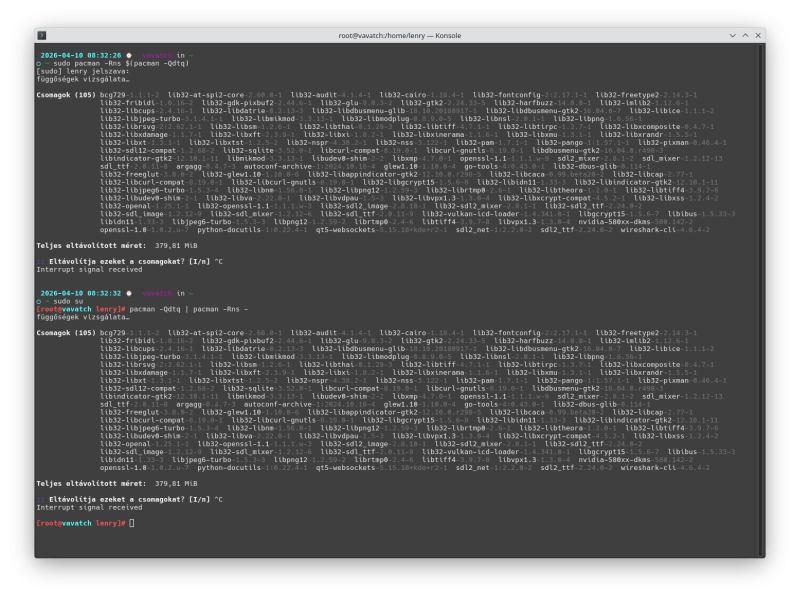 Hogy tudnám ki tisztítani a rendszert? Gondolok itt a nem használt csomagokoról, fájlokról, fennmaradt fájlokra.sudo pacman -Rns $(pacman -Qdtq)