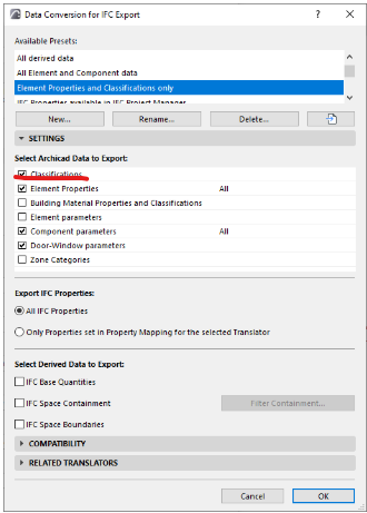 Itt csak a Classification legyen bekapcsolva, akkor nem ment ki túl sok csatolt paramétert az elemekhez, könnyebb lesz beolvasnia RTevit-nek az IFC-t.