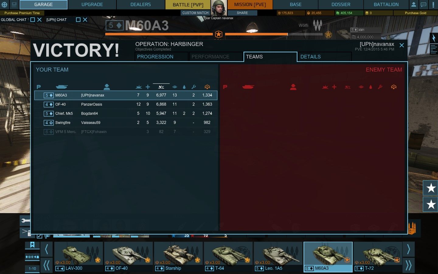Most valami PVE sz.patós event van este? Hardon olyan csapat jött, hogy inkább átmentem medre, mondom, az legalább sima ügy. M60A3, első próba, én vagyok egyedül T5, kaptam 2 Starshitet, valami kis vackot meg egy M109-et. Elsőre szembejön egy T-80 (nem miniboss). Leverjük, jön egy Challenger 1. Mivan??? 31 enemyt számoltam, 9200+ sebzéssel bukta. Következő: Én ugyanazzal, 3 T4 meg egy T3 a csapatban. Abrams jön szembe meg Terminátor.... WTF
