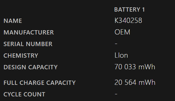 Nálam 70-ből 54Wh még az akku. De ez több körülménytől is függhet. Dyna akkus (hwinfo), általában csendes módban használtam, aki a fogyasztást csökkenti. És legtöbbször type-c dokkolóban, amin át kap áramot. Az irodában a gyári 90W, itthon egy 100W töltővel. Nagy terhelésnél bele-bele nyalna az akkuba is, úgy lehet jobban kopik. Minden nap hozom-viszem az iroda közt. Lekapcsolom addig, mert az alvás win11 alatt hülye és könnyen felébred vagy nem megy le teljesen pihenésbe, hanem pörög tovább a venti, ha olyanja van. Amúgy csak szállításkor kapcsolom ki szinte, napi 20-22 órát megy átlagban.