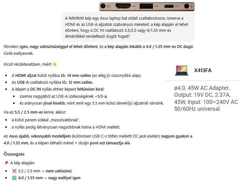 Reggel már a kezemben volt a töltő: 100-240V ~50/60Hz 1.0A; 19V - 2.37A 45W. Mivel lakkfekete, keskeny oldalán sárgás betűkkel és rommá van karcolva, alig tudtam kinézni valamit. 0A001-00696500 jelzés van még rajta, a model talán: A02108020 (az A után a 0 = D is lehet), AD2108020 jelzéssel találtam eMag-on, de ott a csatlakozó mérete 5,5mm-nek van írva, az tuti nem jó. Mérés szintjén 3,5mm a külső, 1,5mm a belső átmérő, de nyilván ebben is lehet hiba.
