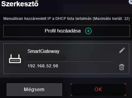 Manuálisan adtam a smartgatewaynek IP-t, a listában ott volt, kiválasztottam, hozzáadtam, majd megadtam a képen látható IP-t. [kép]