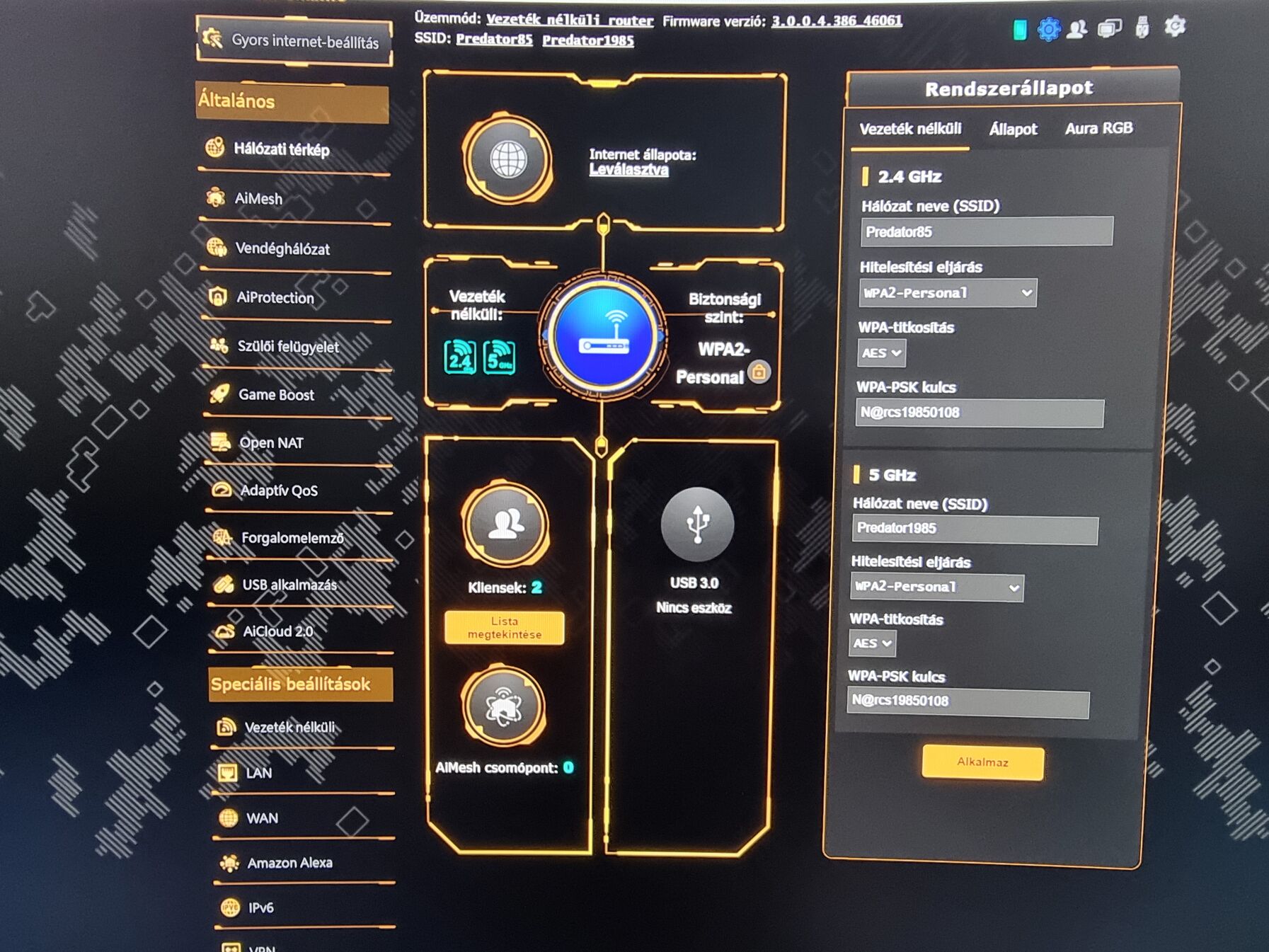 Az Asus Router app-ban és a weblapon is csak a fő router beállításait látom, ami a nappaliban van, a másikat, ami a hálóban, azt nem. A wifi név meg pár dolog együtt van, ez oké, de ki akarom kapcsolni az 5GHz-es frekvenciát, de ez csak a nappaliban lévőn állítódik. Mit kell tennem, hogy a hálóban lévőn is leálljon?