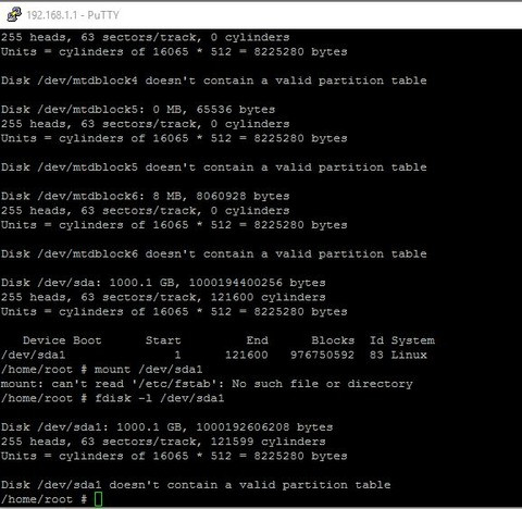 Itt első körben azt látom, hogy nem igazán jó a parancs. mount /dev/sda1 nem elég neki, mivel nem talál fstab fájlt, amiből kiolvasná, hogy merre csatolja. Kellene neki még plusz infó, hogy hova csatolnád. mount /dev/sda1 /azamappaahova/csatolni/akarodalinuxban. Az fdisk azt írja, hogy van rajta egy ext partíció, szerintem ezzel minden redben van így, csak nem csatolja fel a router valamiért automatán.