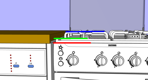 szabadon álló tűzhely alá kell dobogót csinálnom, melyik részével kell/érdemes futnia a munkalap tetéjének? piros, zöld vagy kék vonal?