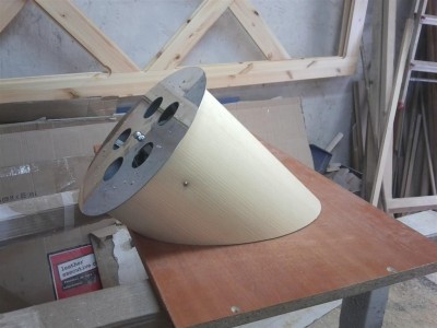 Nem is ez volt a legnehezebb, hanem a lámpa függesztését megoldani belülről úgy, hogy ne a vékony burkolat viselje a terhet, és szerelhető is legyen. A képpel ellentétben nem ilyen pozícióban lesz a lámpa, hanem egy tetőtér lambériájához lesz rögzítve, a lámpa meg vízszintesen áll majd.