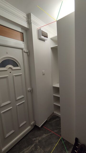 -Nem biztos, hogy oda egybe egy darabot fel tudok tenni, mert ott a villanykapcsoló. Nagy derékszöggel áthidalva kimértem, kb 10 cm van a villanykapcsoló és a bezárt ajtó belső lapja között. Mondjuk akár az még elég is lehet, de ha teszek is ide egy bútorlapot, a villanykapcsoló rejtve lesz, mert annak a billenő kilógó része áll ki 15mm-re a faltól, szerintem kicsit kényelmetlen lenne a kapcsogatása bár ez már most az utolsó szempont..