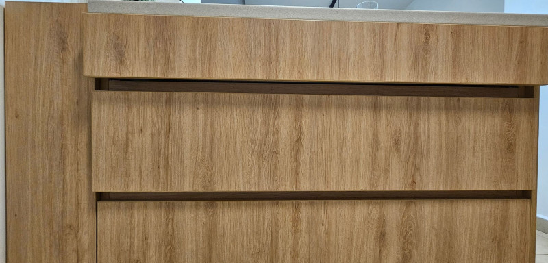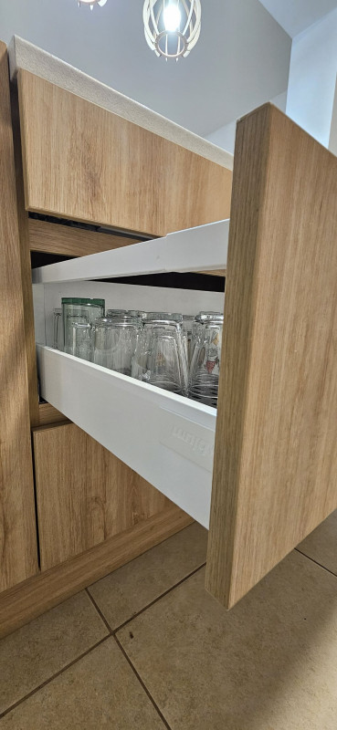 Arról nem is beszélve, hogy sajnos zavaróan hangosak is, mivel a fiók alján lévő szinkronizáló rúd hozzáér a fiókok alatt vízszintesen futó bútoremelekhez (ugye nem érnek össze a fiókok előlapjai, ezért kellett egy fix takaróelem minden fiók közé a bútorba, ahogy a képeken is látszik. Félek tőle, hogy itt a kivitelezés lehet kissé hanyag és túl szorosra lett szerelve a fiók, főleg, mivel a fiók közepe pár mm-rel lentebb van, mint a szélei.