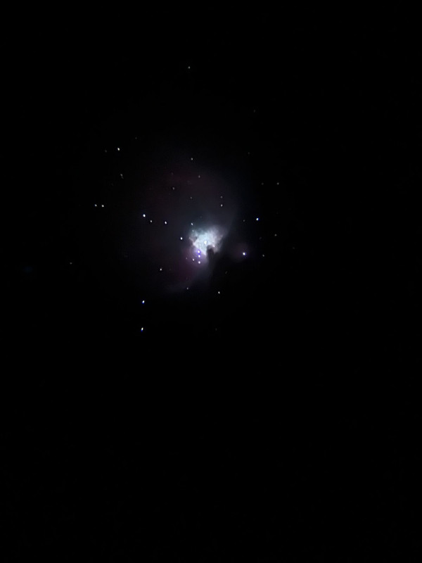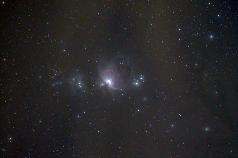 Úgyhogy lefekvés helyett felvittem mindent az erkélyre, ahonnan még pont látszott a sarkcsillag és az M42 is még egy ideig, megint felállítottam-beállítottam mindent, a csúszósra fagyott erkélyen az enyhe szélben már csak 30s működött a korábbi 60s helyett, de végül 37 percnyi képből (Z6II + 70-300G @ 300mm f8 ISO800) hajnali 5-kor DSS-nek és Gimpnek még gyorsan nekiállva ezt hoztam ki