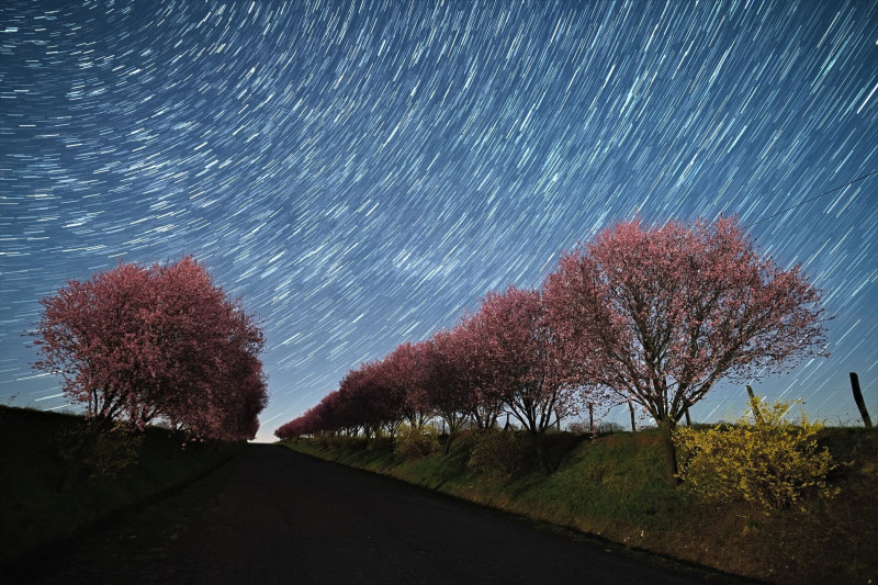 Persze! Nem nagy truváj, leginkább a hely és az idő a speciális benne: virágzott a vérszilvafa, amit megvilágított az 50~55%-os Hold. Nikon Z6II + 20 f1.8G állványon, manuál fókusz, f2.8, ISO800, 15s expók, hogy külön-külön a képeken is még aránylag pontszerűek legyenek a csillagok, reteszelt kioldóval folyamatosan lőtte a képeket. A Hold már alacsonyan állt, sárgás fénnyel, így a WB 4000. Hajnal 1-2, amikor már nem jönnek autók és repülő is kevesebb, addig lőttem, amíg bele nem rondítottak - a fenti kb negyed óra, de van egy másik sorozat is kb 25 perccel. Minimál utómunka (lencsekorrekció, expó, árnyékok) után kiexportált jpg-kből pedig Starstaxben összerakva.