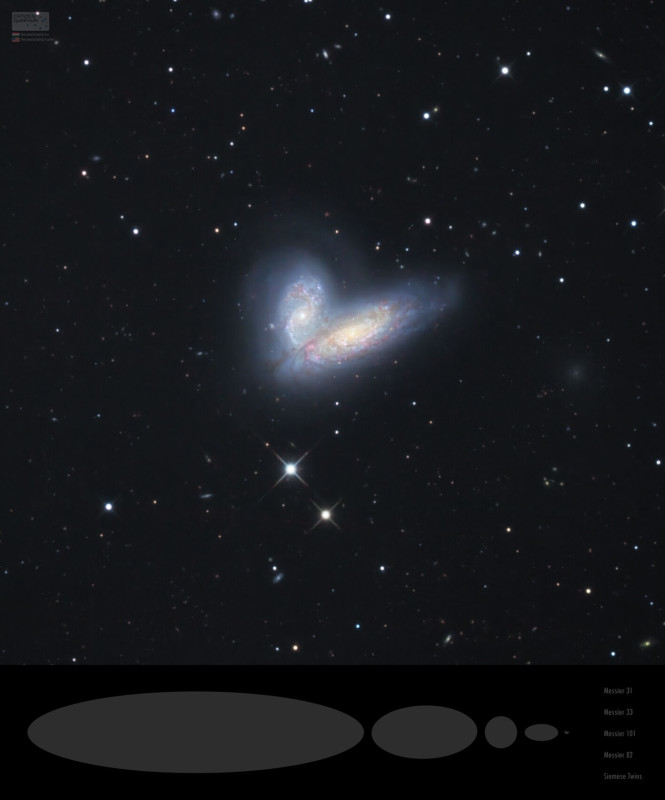 Mikor megépítettem az új távcsövet, egy asztrofotós társam küldött nekem egy csomó nagyon pici, nagyon nehéz témát azzal a felkiáltással, hogy ha van ilyen műszer, ne csak a szokásos témákat fotózzam. Ez a picike páros roppant megfogott. Amatőr szinten nagyon kevesen fotózzák, de szerintem egészen varázslatos a szerkezetük is, a kapcsolatuk is. Nagyon kicsi objektum még ezen a 2100mm-en is. Érdemes megnézni a kép alján a stilizált méret összehasonlítót a korábban fotózott galaxisokról és erről. -