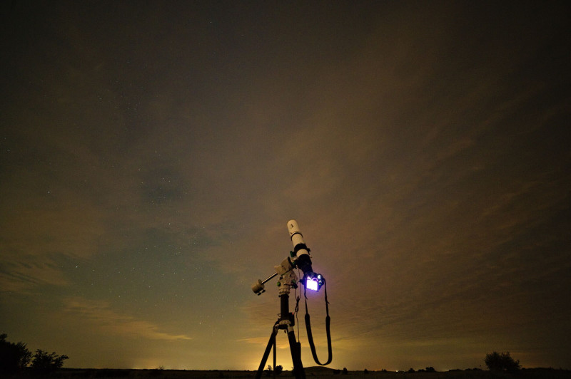 Tegnap az éjjel közepére tiszta időt jósoltak, ezért úgy terveztem, kimegyek. Mire késő este hazaértem és újfent ránéztem az előrejelzésre és webkamerákra, mégis elkezdett felhősödni, ezért kicsit hezitáltam, de amint láttam, hogy itt-ott kicsit tisztul, végül csak elindultam, igaz ezzel időt vesztettem. Na meg azzal is, hogy bő óra a Kiskunság, ahova ki szoktam menni; már majdnem éjfél volt, mire kiértem. Feles volt az ég: felettem, a K-Ny vonaltól északra teljesen beborult; viszont dél felé egyre jobban tisztult, helyenként gyönyörű tiszta volt, a Trifid, Lagúna ködök környéke is egész jól látszódott szabad szemmel. De hát pólusra állni kellene a Sarkcsillag környéke... Addig legalább lőttem pár hangulatképet.