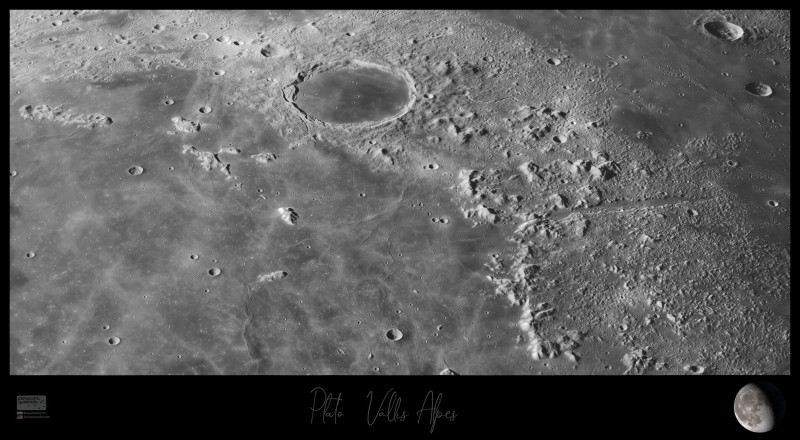 Az Alpesi-völgyről szeretnék készíteni egy közeli, nagy felbontású képet majd, mikor súrlófényben van. Ezért ez a szélesebb átfogású képet eredetileg el is engedtem. De végül úgy döntöttem, van olyan érdekes így együtt, hogy feldolgozom. A képet domináló hatalmas kráter 101 km átmérőjű, lávával töltött terület. Nevét Platón ókori görög filozófusról kapta. A Plato-krátertől jobbra látható a holdbéli Alpok hegység, azaz a Montes Alpes. Ezt szeli ketté a Vallis Alpes völgy, a közepén található hasadék is jól kivehető.