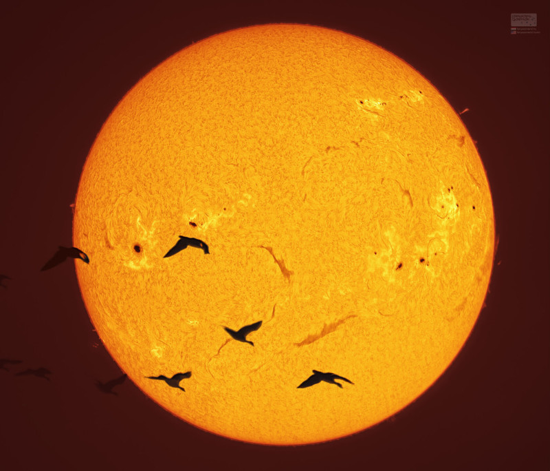 Amióta megvan a naptávcső, vadászok egy ilyen képre... Már legalább 10 órát rögzítettem szándékosan alacsony napállásnál, mikor van esélyem ilyen hosszú fókusznál arra, hogy a nap előtt éles legyen, ha valami elé repül. Dehát ennek az esélye nagyon kicsi. Tegnap hallom a vadludak hangját messziről érkezni a Balaton irányából. Biztos voltam abban, ekkora szerencsém úgy sem lesz. Aztán visszanéztem a képeket és a vezérlúd pont belevezette a napba a teljes csapatot. A színes változat pedig meleg érzetet ad, de feltöltöttem az eredeti monoban is.