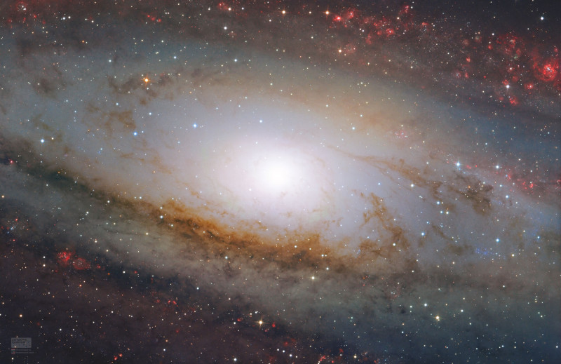 Hoznék egy nagytávcsöves Andromeda verziót, ami a központi régióra koncentrál. Cél volt, hogy ugyan ne essen be a mag, de látszódjanak a porfoszlányok, illetve az emissziós ködösségek részletesebb megmutatását is szerettem volna megtenni. Ez egy kisebb verzió, az oldalamon fenn van nagyobban, lehet vándorolni rajta. -