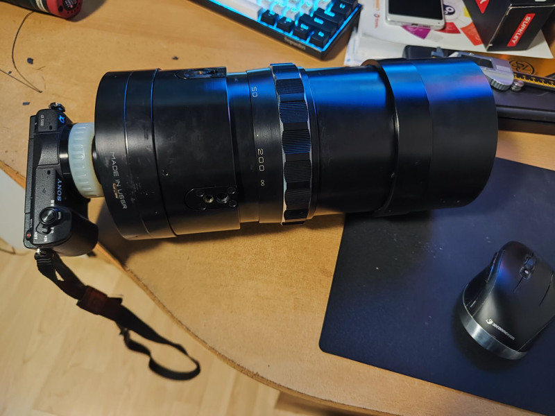 Egyelőre a 70-300-as Minoltával játszok, az MTO-t még szét kell szednem takarítani, illetve kell egy normális adapter. Jelenleg a gép hátulján lévő 3D nyomtatott adapter annyira áttetsző anyagú, hogy több fény megy be a gép kijelzőjéből, ami hátrafelé néz, mint a sötét égre fordított objektívből.