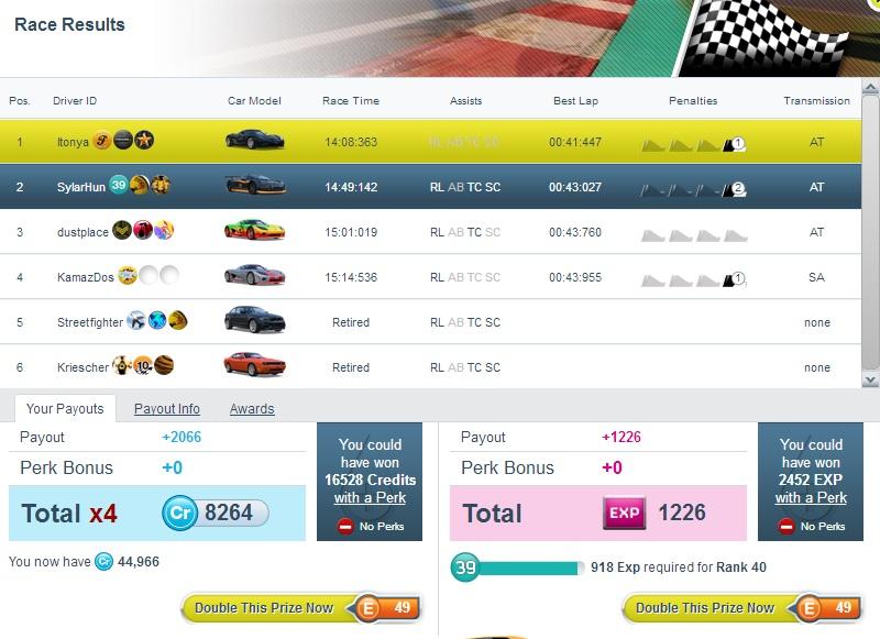 . Felveszlek mindjárt. Közbe rájöttem, hogy néha szintlépéskor kapsz rá lehetőséget, hogy 24órára kibérelj egy autót, ma 3-at kaptam. Legutóbb a BMW MZ4-et. Most azt nyűzöm. Nagyon megtetszett ez a játék. Jó kikapcsolódás, és értelmesebb mint a sok arcade *#°% ami manapság megjelenik.