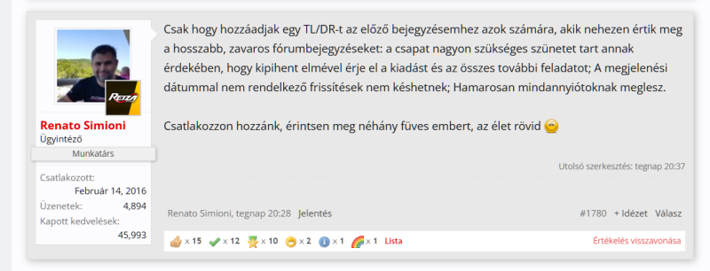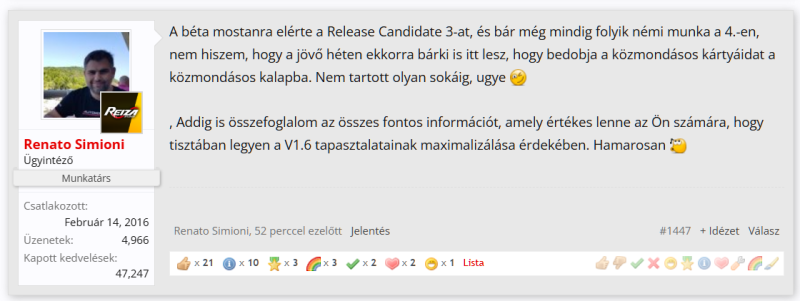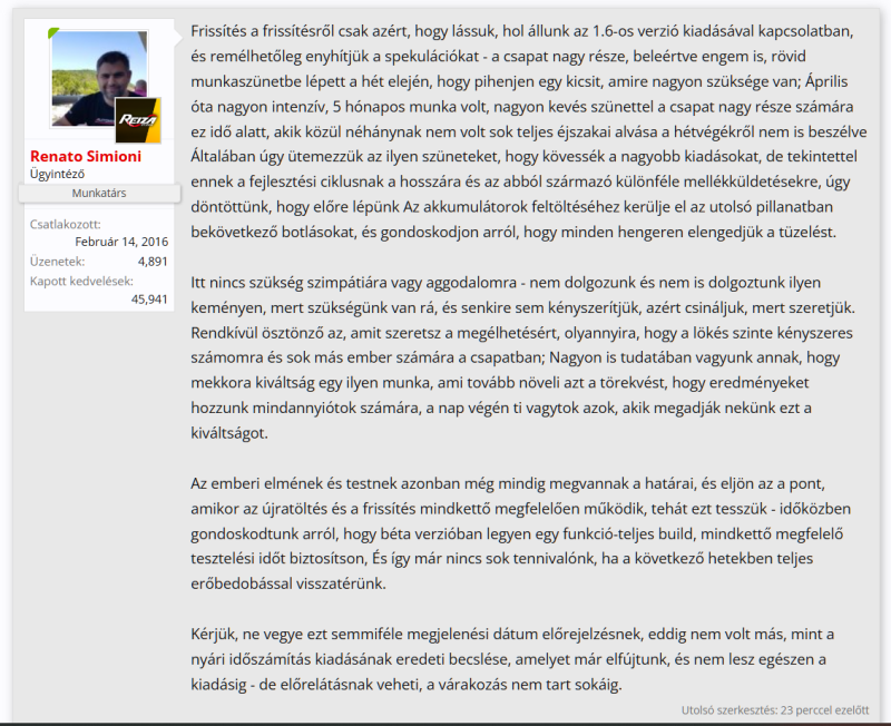 Valahol itt van a kutya elásva. Főleg, hogy Te mint aktív béta tesztelő már sokat láthattál a hamarosan megjelenő 1.6-ból. Ezért most kicsit örülök, hogy azt írod az 1.6-ban sokkal jobb lesz. Nagyon várom a megjelenést tényleg nagy reményeket fűzök hozzá. Csak tegnap este kicsit felbosszantott a fentebb vázolt "jelenet".