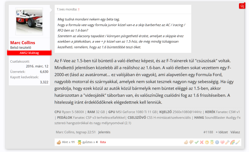 Tisztában vagyok hogy kell idő mire az ember kezére állít egy játéknak az FFB-jét, így meg akarom adni az AMS2-nek is az esélyt. Kíváncsi vagyok hogy majd az 1.6 honnan hova fejleszti. -