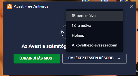 Sziasztok nemrég telepített az Avast Free-t és egy darabig nem is volt vele semmi gond, egészen máig, amikor is az történik, hogy véletlenszerű időközönként egyszerűen feldobja az Avast fő paneljét érthetetlen okokból. Silent módban vagyok tehát semmivel (értsd : SEMMIVEL) nem kéne megzavarnia a gép működését különösen tekintetettel arra, hogy robot makró programok futnak amiknek a futását meg is zavarja szépen a nem kívánatos panel. Utolsó esélyt adom az összes vírusirtónak itt az utolsó az Avast volt és utána ha nem találok rá megoldást záros határidőn belül semmilyen vírusirtó nem lesz a gépemen, tekintve hogy életemben már 10-szer annyit sz*ptam velük mint magukkal a vírusokkal.