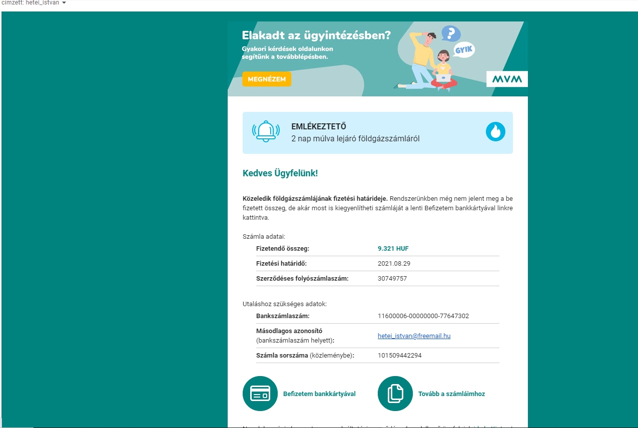 Fel is hívtam őket, állítólag nagyon sok ilyen bejentés érkezett, és valóban adathalászat, és nem mondjuk téves címre küldés, mert jártam ár úgy is. Drága Vodával, hogy nekem küldték ki a számlát. Csak rendes email volt címmel megadva és hát mikor láttam hogy Nyíregyházi lakos akkor sejtettem hogy valami nem kerek. Pl az nem kamu volt, csak rossz emailre küldték a számlát, Ez viszont jó nagy kamu.