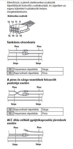 A sárga vezetéken kap állandó áramellátást (pl a rádióadók tárolásához), a piros vezeték meg arról gondoskodik, hogy gyújtás kapcsolása esetén bekapcsolja a rádiót.