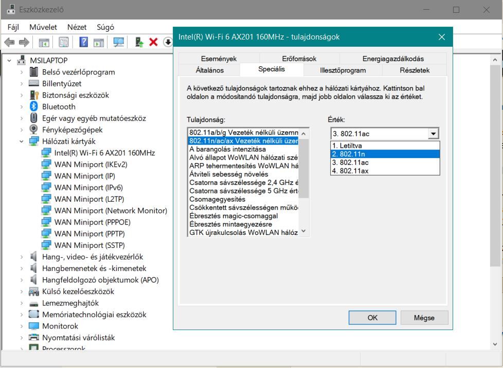 Egy próbát megér: Eszközkezelő, Hálózati kártyák, WiFi kártya, Tulajdonságok, Speciális fül. Itt keressél olyan beállítást, amelyik kikényszeríti, hogy melyik protokoll legyen alkalmazva. Ha például a 11n stabil, akkor legyen az.