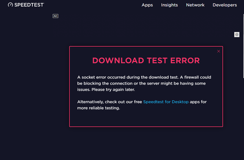 A problémám a következő: LAN-on keresztűl nem működik rendesen a laptop, igazából egyáltalán nem műkődik. Csatlakozva van, érzékeli is a lan kábelt, fel is csatlakozik a netre de az oldalakat alig akarja betőlteni, sőt egy normális speedtest mérést nem tudok vele végigcsinálni mert a következő hibát dobja fel.