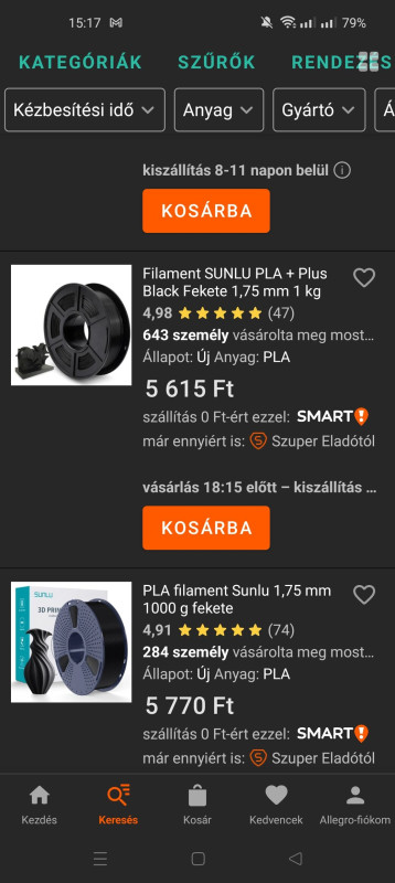 Mostanában az Allegróról rendelek, épp most is jött 2kg ezüst sunlu silk. Regisztráció után kapsz 8db ingyen (smart) szállitást, + 16e feletti vásárlásnál 4e ft os kupont. Szlovákiából jön dod vel,3nap alatt itt voltak.