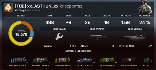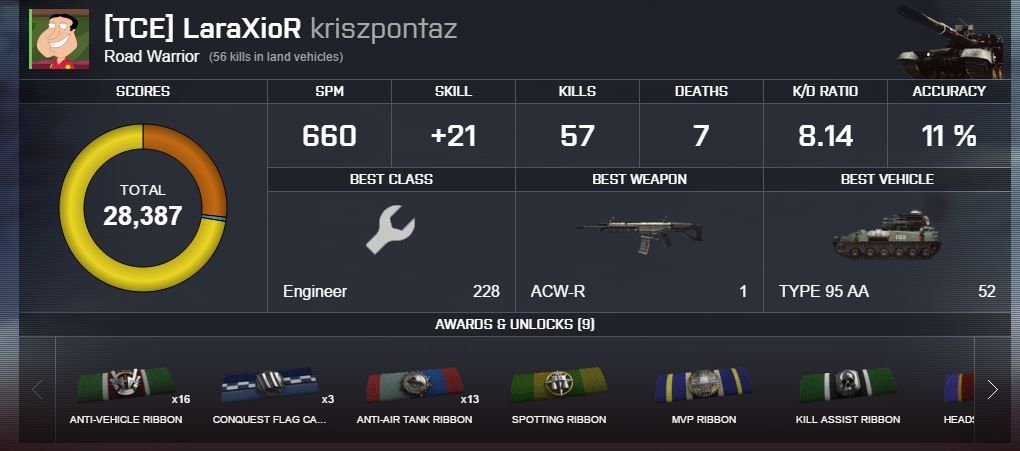 General (All of these pertain to your current stats, i.e.your current Skill on Battlelog goes here, if your Skill goes down, so does this stat)