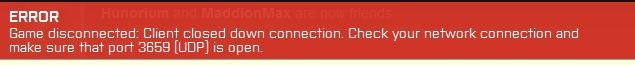Game disconnected: Client closed down connection. Check your network connection and make sure that port 3659 (UDP) is open. -