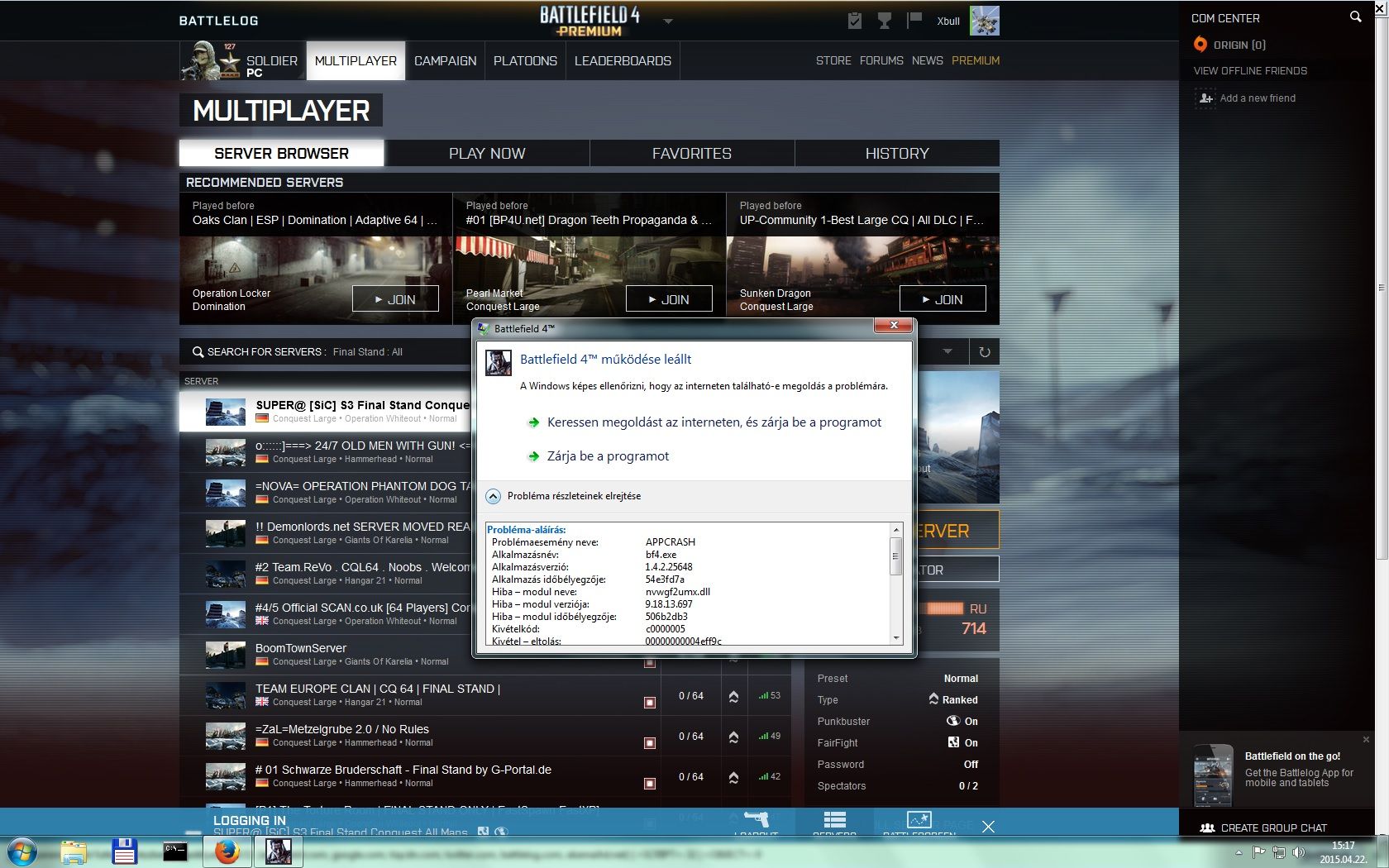 De ha hiányolja azt a retket és e miatt nem enged be a szervere akkor legyen már az hiba ablakba egy közvetlen link hogy ne nekem keljen keresni hogy mi a fr@ncért is nem akar játszani engedniNa de mindegy lassan csak jön valami ami levájta a bf4-et, ha más nem a következő bf rész