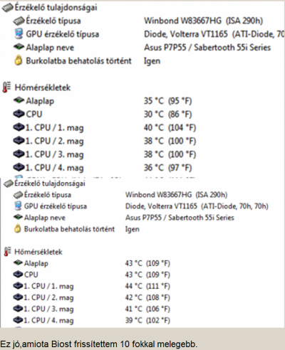 Gigabyte EP35C-DS3R alaplapom BIOS-át frissítettem F2-ről, F4-re és azt vettem, hogy a processzorhűtő nem dolgozik megfelelően. F2-vel az Everest rendszerstabilitás tesztjén 15-20 perc után sem ment 60°C fölé a CPU-hőmérséklet, míg az F4-gyel másfél perc alatt felment 80°C fölé, míg a ventillátor 1400 forduélaton pörgött. Visszaraktam az F2-t megint stabilan 60°C alatt marad 900-as ventillátorfordulaton. Most az F3-mal kisérletezem, eddig jónak tűnik.